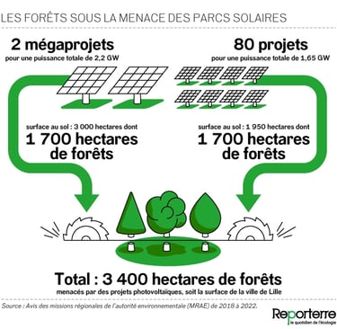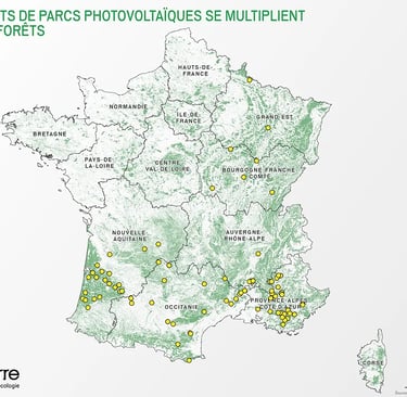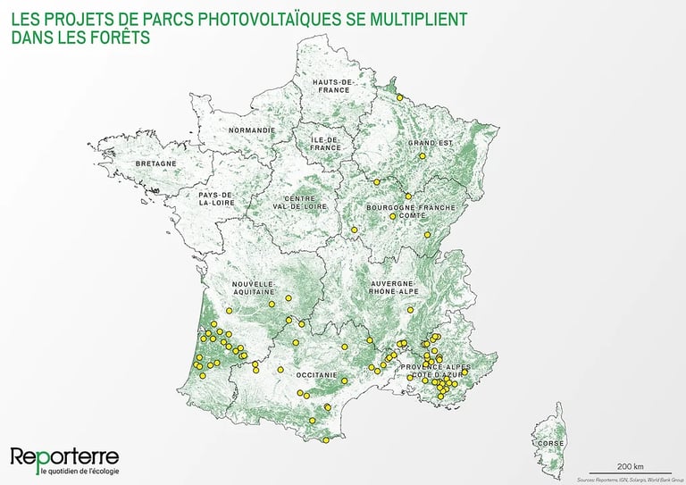 Encore minoritaire, l’installation de panneaux photovoltaïques sur des forêts n’en demeure pas moins problématique d’un point de vue écologique. Reporterre a identifié 82 projets et 3 400 hectares de forêts menacés.